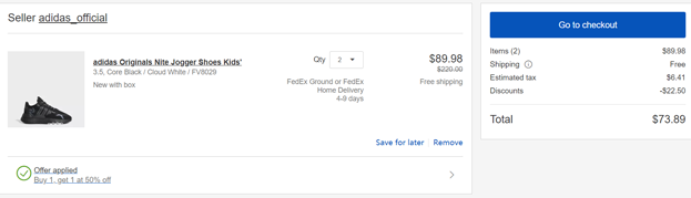 | 内容: | eBay阿迪达斯旗舰店精选鞋服满$100额外75折,无需用码,加入购物显示折后价;专区直达>>> 这款Adidas ORIGINALS NITE JOGGER大童运动鞋,售价降至$44.99,凑单折后实付$33.75,美国境内免邮,转运到手约319元,目前big 5.5/6码有货; 新出单一卖家结算商品金额满$88美金立减$15,需用码“PCNEASTER20”每个用户限使用一次,有效期至4/24/2020,限前7,000名用户; 全新NITE JOGGER 搭载经典的缓震ColorBOOST 中底,拥有高规格的面料与视觉层次。 注意:实物与下图有些许区别,具体表现在鞋底颜色处,以网站图为主: