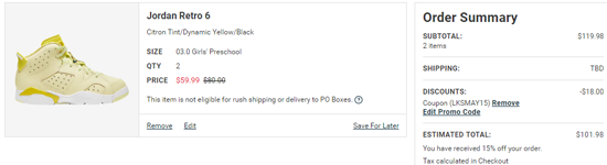 | 内容: | Eastbay现有: -满$50享9折优惠,需用码“LKSMAY10”,截至6月1日中午; -全场满$75享85折优惠,需用码“LKSMAY15”,截至6月1日中午; 此款Air Jordan RETRO 6 花卉黄中童款运动鞋,售价降至$59.99,还叠加满额85折优惠,折后价$50.99,比上次推荐降价9刀,美国包邮,转运到手约470元。目前big 3码有货,小脚妹子福利。 这双 Air Jordan Retro 6 挺拔的鞋身造型上以一袭清新的柠檬黄色示人,白色中底上同样勾勒带有黄色色带,最大亮点当属黄色鞋舌上一朵巨大的黄色花朵刺绣,黑色线条勾边,同时还有绿叶相衬,还有一个黑色的 Jumpman LOGO,彰显出十足的霸气