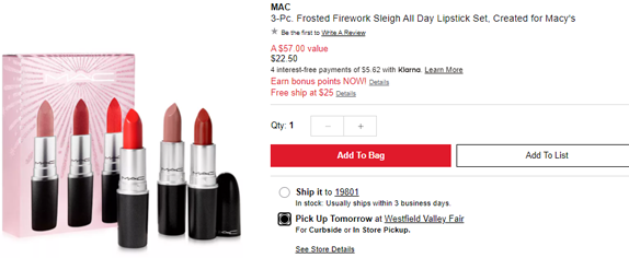 Macy's梅西百货的这款MAC 2020年梅西独家唇膏3件套补货了,价值$55.5,现售价$22.5,美国境内满$25免邮;