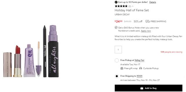 | 内容: | Nordstrom的这款URBAN DECAY Holiday套装,价值$80,现售价降至5折$24.5; 结账自选3小样,结账页面自选即可; 套装包含URBAN DECAY正装眼部打底10ml、正装唇膏 Bad Blood、正装眼线笔Zero、旅行装定妆喷雾30ml,总价值$80。