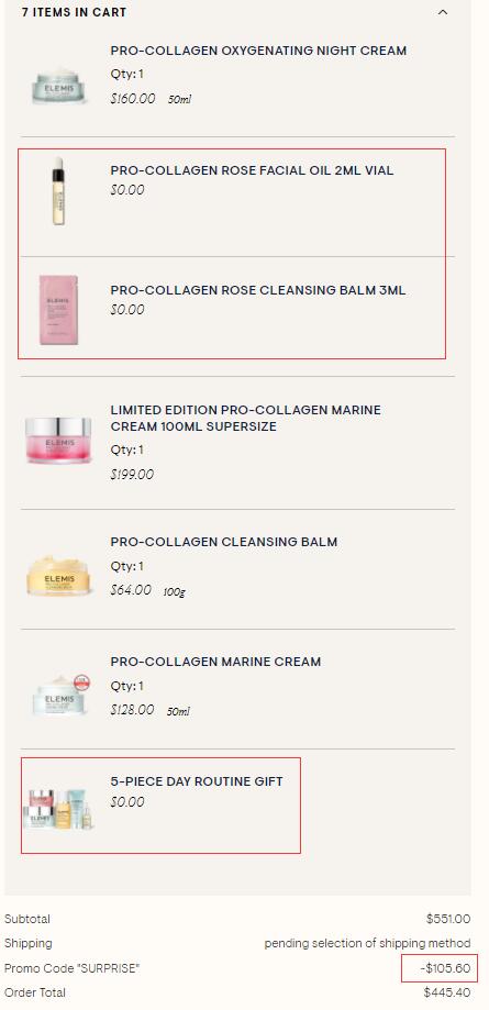 另外,用以上优惠码折后订单满$125送晨间或晚间护肤5件套,购物车自选即可;