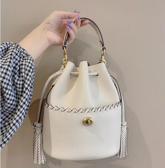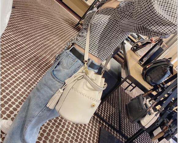 这款Coach蔻驰Lora抽绳水桶包,采用抛光鹅卵石皮革制成,手感非常柔软耐用,而且具备了一定的弹性和韧性,让包包具备一定的延展性,流苏抽绳增加了精致感,21cm*15cm*25cm。