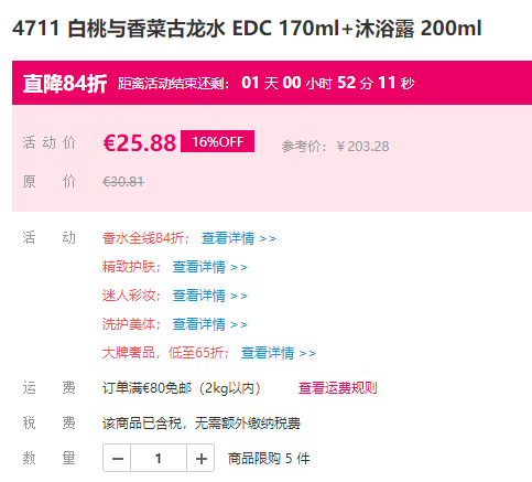| 标题: | 4711 白桃与香菜古龙水 EDC 170ml+沐浴露 200ml |