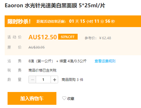 | 内容: | Amcal澳洲药房的这款Eaoron美白面膜 25ml/片(美白+补水,一盒5片),特价AU$12.5,约¥62; 全场满89澳免邮2kg; EAORON美白黑面膜以AHI红杉山纤维面膜为基础材料,将日本钨钢栎纯炭粉融合在一起,制成备长炭纤维。作为澳洲第一款美白黑面膜,它的膜材选择上,同时具备了天然植物成份和高科技制作工艺两大特点。作为与人的肌肤最亲近的护肤品,面膜必须具备100%的安全性,拒绝一切的毒面膜,所以必须选择纯植物纤维的。日本钳钨钢栎是日本的原生珍贵木材,经1200度的高温,形成多孔质的,内部充满许多结构坚硬的不规则的致密孔洞的炭纤维结构,它极强的天然吸附能力和大量负离子,能让使用者轻松美白,脸色红润,“以黑吸黑”。