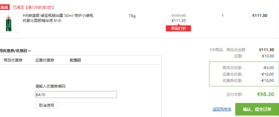 | 内容: | BA保镖药房的这款HR赫莲娜 绿宝瓶 悦活新生面部精华液 50ml,售价?11.3,下单立减3欧,还可叠加满88欧立减10欧优惠,需用码:BA10,折后实付?8.3,一件直邮含税到手约770元; 这款精华露主打修复、抗老、滋润的功效,添加2倍的专利萃取“海洋堇”活性植物原生细胞。官方称,该精华有刺激细胞新生、促进肌肤表层修复及强大抗氧化的功效,并配合神经酰胺、玻尿酸及一些植物萃取精华,协同达成修复、抗老、润泽肌肤的功效。质地细腻、润泽但不油腻,吸收快速,既可以当做精华使用,也可以当做肌底液使用。