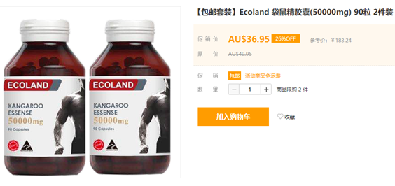 Amcal澳洲药房的这款Ecoland 袋鼠精胶囊(50000mg) 90粒 2件装,目前售价AU36.95,一件免邮到手约¥183,澳洲直邮,吃的放心!