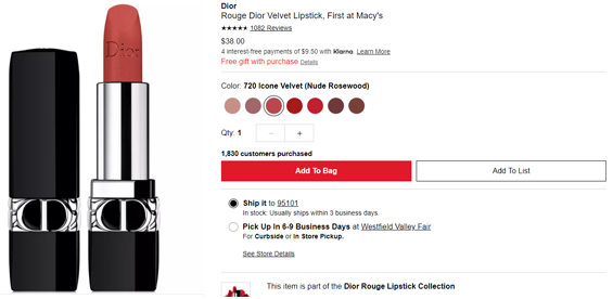 | 内容: | 网站需在境外网络环境下打开! 目前梅西百货这款Dior烈焰蓝金唇膏丝绒#720补货了,售价$38; 美国境内满$25免邮; 若直达链接到首页,搜索栏输入“11768028” 全新Dior烈焰蓝金唇膏,这次的新品简直是颜值天花板。新包装,新色号,新质地。丝绒质地真的绝,不是一般的绝,高级柔雾的感觉,新配方膏体注入了花卉精粹,一点都不拔干。720枣泥红棕色,薄涂还带点豆沙调调,温温柔柔的。厚涂野蔷薇的感觉~看起来整个人气质好好。