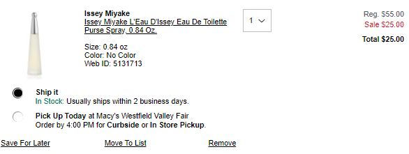 | 内容: | Macy's梅西百货的这款Issey Miyake三宅一生 一生之水 女士香水 25ml,售价降至$25(需要加入购物车显示折后价),订单美国境内免邮。 折扣至北京时间2月8日下午; Issey Miyake三宅一生女士香水 ,整合了泉水中的睡莲以及东方花香,清如春天的香水,完全属于女性的柔情。前调是睡莲、玫瑰香水和樱草属植物融合的湿润异香,有植物般的清新气象,中调变化满溢鲜花味道,盛放的牡丹和百合弥漫着淡雅幽香,基调充满森林气息,有柔和花香及神秘幻影造成的悠远绵长的味道。