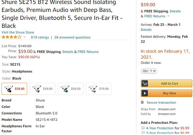 | 标题: | Shure SE215 动圈耳机 带官方蓝牙5.0耳机线特价$59 |
