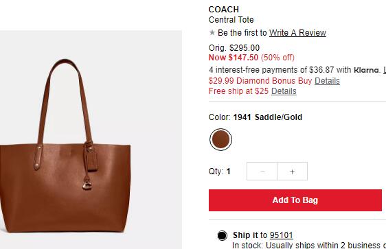 标题: 棕色补货!COACH Central 女士托特包5折$147.5