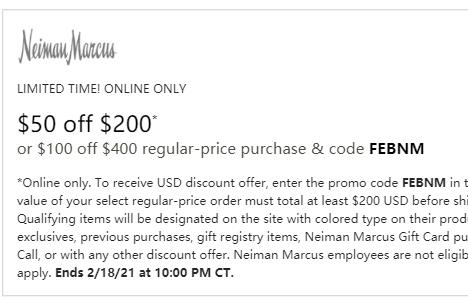Neiman Marcus 现有全场正价时尚类单品满$200减$50、满$400减$100、需使用优惠码“FEBNM”;