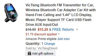 | 内容: | 目前美国亚马逊的这款 VicTsing 车载蓝牙发射器 支持USB快充 FM收音 ,现价$15.29(点击页面10%的coupon),刚需价,订单满$25美国境内免运费; 这款车载充电器提供1个5V/2.1A的USB快充口和1个普通USB用于读取数据,支持MicroSD卡读取,还配备了蓝牙和FM发射功能,不仅可以通过蓝牙连接手机打电话,还可以在没有蓝牙或AUX口的老爷车上通过FM发射功能播放手机和其它蓝牙设备的歌曲。自带一个1.44”的屏,方便司机操作。