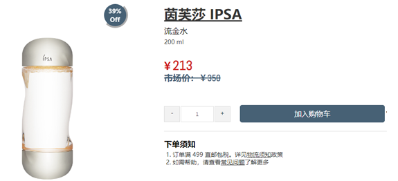| 内容: | 目前Beauty House官网这款IPSA茵芙纱 流金水 200ml,售价降至¥213,入手好价,需要可入。 消费满499元可享受免邮跨境配送服务; IPSA一直深受欢迎的THE TIME RESET流金岁月系列为肌肤源源注入大量水分,此款流金水为14年全新升级版,去掉了酒精成分越发的温和,比原来的更保湿,更多抗氧化。台湾翻译美肤微整机能液,香港还是叫生肌水源素。