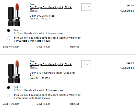 | 内容: | 网站需在境外网络环境下打开! 目前梅西百货这款Dior烈焰蓝金唇膏丝绒#999/840补货了,售价$38; 美国境内满$25免邮; 若直达链接到首页,搜索栏输入“11768028” 全新Dior烈焰蓝金唇膏,这次的新品简直是颜值天花板。新包装,新色号,新质地。丝绒质地真的绝,不是一般的绝,高级柔雾的感觉,新配方膏体注入了花卉精粹,一点都不拔干。图上是很丝滑很舒服的感觉。 999真的是什么时候涂都会好看的一支吧?经典中的经典,百搭款。再加上这次的全新丝绒质地,妆感真的很高级,很有气场。