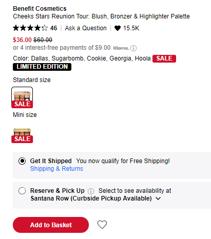 目前丝芙兰美国这款Benefit贝玲妃 Cheek Stars Reunion Tour面部彩妆盘,售价降至6折$36;