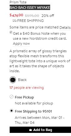 | 内容: | 网站需在境外网络环境下打开! Nordstrom这款Bao Bao Issey Prism 菱格托特包 黑色,售价8折$476,美国免邮,预估4磅国际运费,转运到手约3300元; 三宅一生手提包,采用多种材质,它可以任意的扭曲塑形,透过比例运算与结合后将四个三角形拼接成一个正方形,潮流个性的几何元素,感觉既酷炫又个性,呈现出一种独特的个性风潮