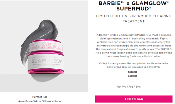 | 内容: | GlamGlow美国官网的这款GLAMGLOW X BARBIE?限定白罐 50g,售价降至5折$30,美国境内免邮; 这次推荐的是Glamglow Super Clearing白罐清洁面膜,是较基础款黑罐的升级版,富含AHA和BHA酸,能有效地处理受损的皮肤,活性碳分子能够有效地吸附有毒物质,合理清除肌肤内的垃圾,恢复肌肤最佳状态,比较适合混合性及油性肤质。本款面膜可全脸使用,也可局部使用,开始会有些许刺痛感,不过很快就会消失,按实际需求停留在脸上5-15分钟不等,清洁时建议使用洗脸棉做旋转清洁。
