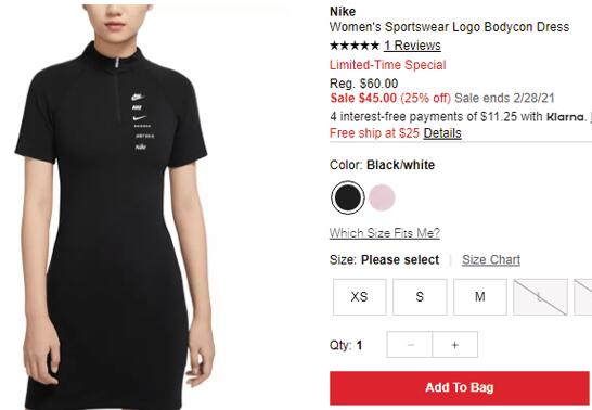 Macy's梅西百货这款Nike耐克Sportswear连衣裙,售价降至$45(约290元),美国包邮,目前 XS-M码有货;