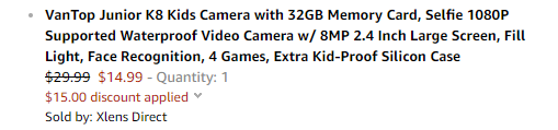 | 内容: | 目前美国亚马逊的这款VanTop 儿童防水数码相机,售价$29.99,现有5折优惠,需用码:QLV2N5TT,或勾选页面“50% extra savings coupon applied at checkout”,折后$14.99,美国境内免邮;
