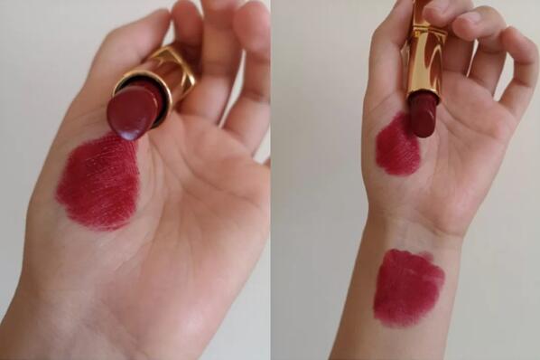 这只魔鬼#176,一个非常~正的大红色,薄涂会是偏橘的水红色,在暖光下有点像MAC的cockney草莓色,觉得满涂厚涂更好看,会比较有特色,适合对显色度要求高的人,显得整个人很有活力窗如果是厚涂它就是偏正红~而且刚刚开始涂上嘴的时候比较滋润,时间久了就会变干一点,对于喜欢哑光质地但是时而嘴唇干裂的人来说就是一个福音!