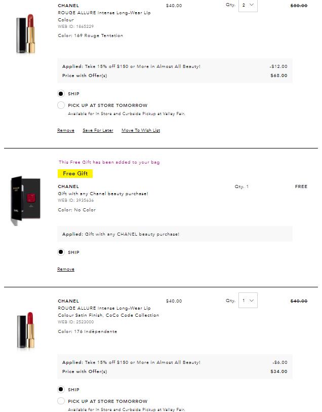 | 内容: | Bloomingdales全场美妆护肤满$150享额外85折,无需用码,满额自动打折; 这款CHANEL ROUGE ALLURE 唇膏 169/176,售价$40,加入购物车折后$34; 另外任意CHANEL订单还送试色小样,购物车自动出现; 订单买美妆满$50包邮, 或者Loyallist免运费(可免费加入Loyallist program), 结账时输入Loyalist ID即可。结算输入免税州邮编后消费税自动消失; 169绝美浆果色,白皮涂清冷高贵!复古法式宫廷仙女就是你!黄皮涂气色立马变好uPuP!挽救你的素颜气质!!显白必备口红,滋润的奶油质地,易涂抹,上嘴舒适,不显唇纹,持久度也可;