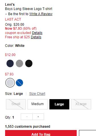 | 标题: | Levi\\\'s 李维斯男童款长袖T恤折后$7.93 |