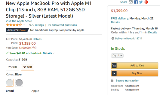 | 标题: | Apple MacBook Pro 13.3英寸笔记本电脑 (M1, 8GB, 512GB)折后价$1349.99 |