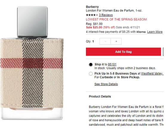 | 内容: | 网站需在境外网络环境下打开! Macys梅西这款BURBERRY 博柏利 伦敦女士 EDP 30ml,售价降至$25,订单满25美金包邮,限购3件; 自然淡雅的前调融合了玫瑰香和金银花香。深沉馥郁的中调释放白栀子花香、茉莉花香和牡丹花香,并透出一丝清新甜爽的柑橘香。基调中的檀香木香、麝香和广藿香为香氛增添淡然雅致的温暖气息。