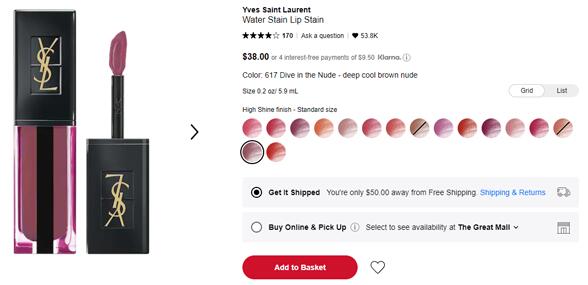 目前丝芙兰美国的这款YSL圣罗兰19年夏款water stain水光染唇露617号色补货,售价$38;