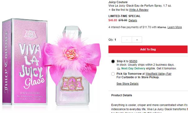 | 内容: | 网站需在境外网络环境下打开! Macys梅西百货的Juicy Couture Viva La Juicy Glacé万岁女性香水50ml,现在售价6折$46.8,订单满$25美国境内免运费。 Juicy Couture 这种华丽而又甜腻腻的香水真的好有恋爱的味道啊,很像坐在甜品店里吃着蛋糕闻着的香甜柑橘 味~ 这是一款开朗、调皮又充满浪漫气息的作品。