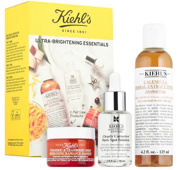 这款套装包含:金盏花水125ml、淡斑精华30ml、姜黄蔓越莓籽活力亮采面膜28ml。