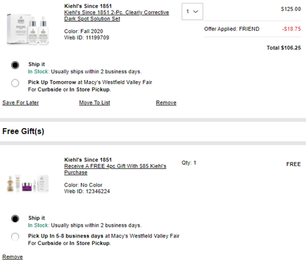 | 内容: | 网站需在境外网络环境下打开! Macy's梅西百货这款Kiehl's科颜氏 焕白亮肤淡斑精华 50ml*2瓶,售价$125,可叠加额外85折,需用码“FRIEND”,折后$106.25; 另外科颜氏订单满85还送4件套,满额自动加车; 这款可是名气很大呢,销售超过60万瓶,回购No.1的美白精华。独特小分子活力维生素C,深层修护亮白,有效淡化班点,预防斑点生成,均匀肤色,使肌肤更显无瑕润白。凝露质地,非常轻薄,好吸收,不粘腻也不干。而且,最重要的是,是真的有效。淡斑和提亮肤色这种事儿,需要有点耐心,只擦三五天是不行的。是需要一段时间的。