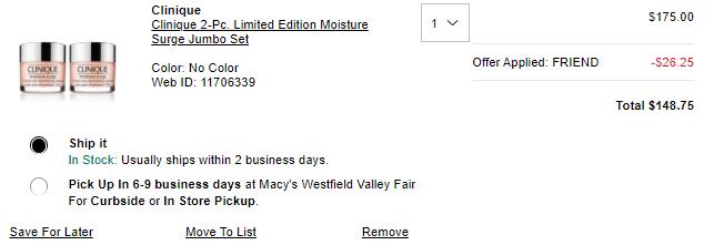 | 内容: | 网站需在境外网络环境下打开! 梅西百货新上这款水磁场面霜限量装200ml双瓶装,售价$175,用码“FRIEND”享85折,折后$148.75; 另外,购Clinique满$65送送护肤2件套,满$85赠自选好礼双份,满$100赠tote包,满额自动加车; 他家最热门的产品之一,基础补水的面霜,最适合白天用。