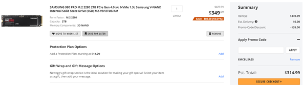 | 内容: | 目前美国新蛋此款SAMSUNG 980 PRO 2TB PCIe NVMe Gen4 M.2 固态硬盘,特价$314.99(原价$429.99)需用码:EMCEUSA25,美国境内免运费。 三星 V-NAND 3-bit MLC,三星 Elpis 控制器,持续读取速度可达 7000MB/s,持续写入速度可达 5000MB/s,随机速度达到 1M IOPS。SN850、980 Pro 都是第二代 PCIe4.0 SSD,相比初代产品,7GB/s 的持续读取速度已经逼近带宽上线,随机速度也比 PCIe3.0 时代要显著提升,随之而来的发热量自然也不会小。如果你是高端 X570、B550、Z590 主板,980 PRO 还是非常值得入手的,理论上也可以给 PS5 使用,笔记本就完全不推荐了。
