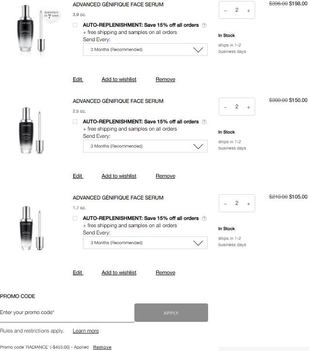 | 内容: | Lanc?me美国官网这款Lanc?me 小黑瓶肌底液买一送一促销 , 加车2件,用码:RADIANCE,多规格都参加,小编建议收115ml款,最划算! -50ml款,原价$105,加车2件用码,折后$52.5一瓶,约345元; -75ml款,原价$150,加车2件用码,折后$75一瓶,约492元; -115ml款,原价$198,加车2件用码,折后$99一瓶,约650元; Genifique 精华肌底液,俗称“小黑瓶”,富含衡量肌肤年轻状态的“修护”蛋白质,并运用科技具有重新激活基因活性的功效,长期使用可使肌肤的触感越来越细腻柔滑,肤色变得纯净匀亮,肤质紧密而富有弹性,增强后续保养品的吸收能力,适合25岁以上皮肤暗哑无光、肤色不均、缺水的各式肌肤。
