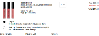 | 内容: | 网站需在境外网络环境下打开! 梅西百货这款Bobbi Brown 迷你唇釉3支装,售价5折$14.5,需要可关注; 美国境内满$25免邮; 光滑保湿的唇彩包含了3款日常百搭色系,有Free Spirit、New Romantic、Love Letter色号, 不仅超显起色,还能随时维持嘴唇水润感~