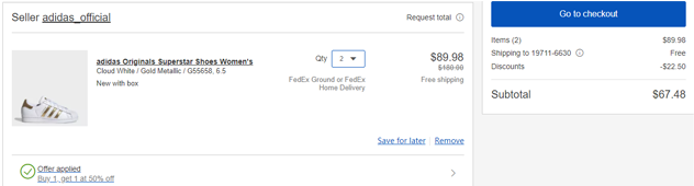 | 内容: | eBay阿迪达斯旗舰店现有精选鞋服第二件半价促销,无需用码,加车2件自动折; 部分商品不参加活动,以加入购物车为准; 美国境内免邮,活动截止时间未知。 相信每个人的鞋柜里都有一款跑鞋,不管是平时健身、出门旅行或是日常工作都能运用自如,现在活动专区内多款精选商品促销,也有不少昔日爆款,喜欢的朋友可以进场逛逛啦!