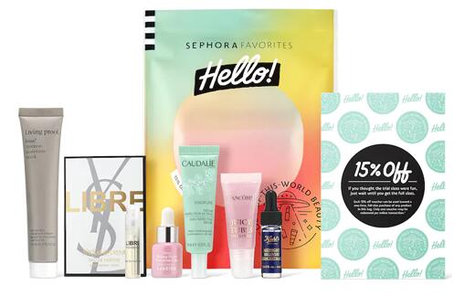 套装包含兰蔻唇彩7ml、科颜氏午夜精华4ml、欧缇丽水杨酸精华液10ml、兰芝Glowy妆前乳5ml、YSL试管香水1.2ml、Living proof免洗发膜30ml、85折礼卡。