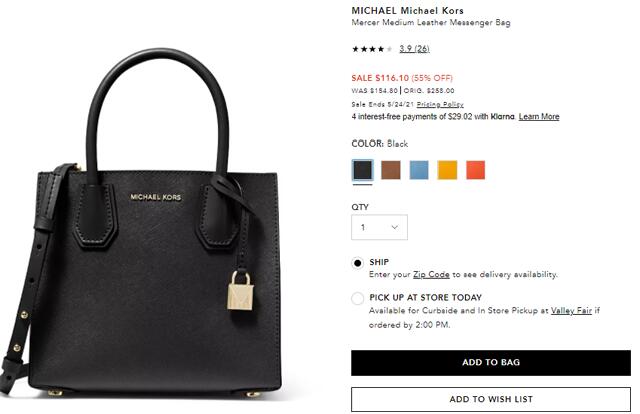 | 内容: | Bloomingdales这款Michael Kors Mercer 系列中号锁头包,售价降至45折$116.1,近期好价,目前颜色相对较全,有5色可选, 这款Mercer手袋造型简约,选用了精巧的锁扣,使包袋既低调又有质感。外层压印十字纹,使包袋拥有柔和而挺阔的外型,整体轻巧便于携带。活泼之余又不失稳重。内置的拉链口袋可以轻松容纳个人物品。