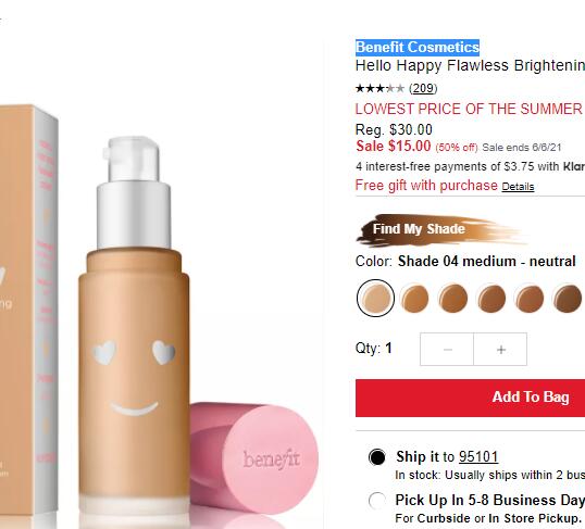 | 内容: | 网站需在境外网络环境下打开! Macys梅西百货这款Benefit 新款Hello Happy笑脸粉底液,售价降至5折$15; 购买Benefit 产品满$50送彩妆2件套; 订单满$25美国境内免邮; 人生没有过不去的坎, 但是一个笑脸就笑笑过去了! 带着笑脸的Benefit Hello Happy Flawless Brightening Foundation 粉底液, 可维持12小时长效的丝滑无瑕的底妆, 色泽微粒让你在任何灯光角度下都美美哒!