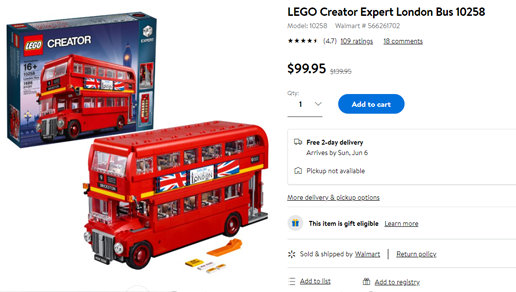 | 内容: | almart的这款LEGO乐高 百变高手系列 伦敦巴士,售价降至71折$99.95,美国境内免运费。 伦敦巴士(10258)发售于2017年8月1日,官网始终没有打过折,由1686块积木组成。拼搭完之后的大小约为:7” (18cm) 高,13” (34cm) 长,5” (13cm) 宽。车顶和上层平台可拆下欣赏内饰。百变高手系列一直秉持着“细节”,这款双层巴士也不例外,鲜红色经典车身曲线,带全景挡风玻璃的驾驶室,可翻转的广告海报、特别制作的标准胎面轮胎等,从发动机,乘客座位,到旋转楼梯、伞桶、售票口都做的相当细致,高还原度。座位上还有落下的空饮料瓶和报纸。