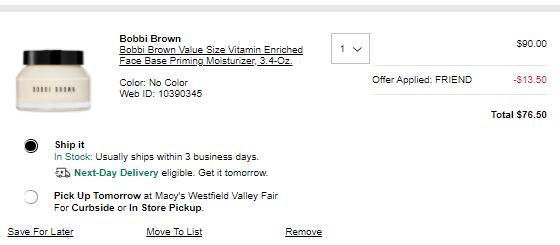 | 内容: | 网站需在境外网络环境下打开! 梅西百货这款Bobbi Brown 芭比波朗橘子面霜 100ml,售价降至85折$76.5,需用码FRIEND; 还叠加满赠多种礼包,具体细节如下: 1、购Bobbi Brown芭比布朗满$75赠送彩妆3件套,满额自动加车; 3、购Bobbi Brown芭比布朗满$125赠送正装保湿面霜; 美国境内满$25免运费 Bobbi Brown 的网红单品?橘子面霜,简直是清透底妆的打底必备,淡黄色的膏体状,味道闻起来像是那种橘子的香气,上脸真的非常润,吸收的特别好,完全不油腻,皮肤看上去就很细腻有光泽,最重要的是后续底妆也变得特别服帖,完全不会搓泥和卡粉。