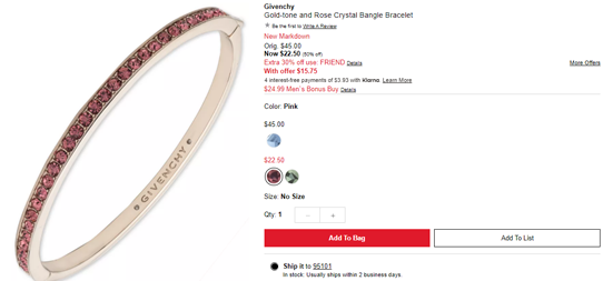 | 标题: | Givenchy纪梵希镶钻手镯折后价$15.75 |