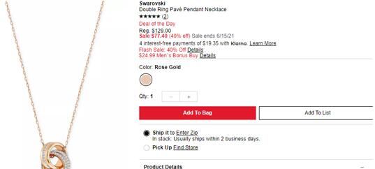 | 内容: | 网站暂时需在境外网络环境下打开! Macy's梅西百货现有精选施华洛世奇首饰限时1日6折促销,无需用码,折后价显示在页面处; 其中这款Swarovski施华洛世奇 双环项链,现售价降至6折$77.4,约498元。美国境内满$75免运费。 施华洛世奇玫瑰金双环项链,卡地亚同款。又被称为:时来运转,神似宝格丽,带上真的很闪,很亮,虽然施华洛世奇的水晶不是钻石,但是性价比真的是绝了。