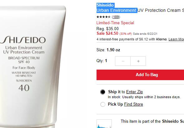 | 内容: | 网站需在境外网络环境下打开! Macys梅西百货这款Shiseido资生堂新艳阳隔离防晒乳霜 60ml SPF40,售价降至7折$24.5,美国境内满$25包邮; 这款新艳阳夏防晒系列,沿用倍受推崇的多重保护防御系统,纯物理防晒,不添加酒精、香料和防腐剂,有效阻隔紫外线的遮光剂,以达成卓效的防晒效果,各方面抵挡日益增强的紫外线威胁。