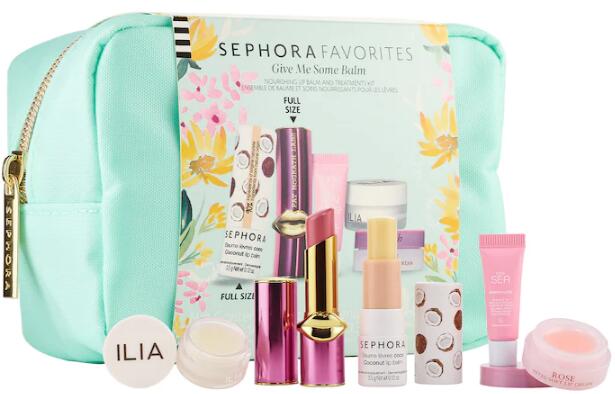 套装包含:ILIA Lip Wrap磨砂唇膜4 mL、fresh玫瑰润唇膏2 mL、SEPHORA COLLECTION正装润唇膏、PAT McGRATH LABS润唇膏正装2.5 g、 tarte润唇膏3 mL。