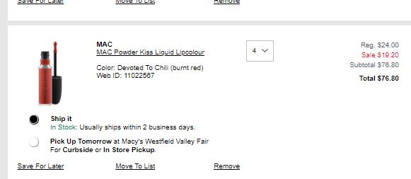 Macys梅西精选部分mac魅可彩妆额外8折促销,页面直接显示促销价;