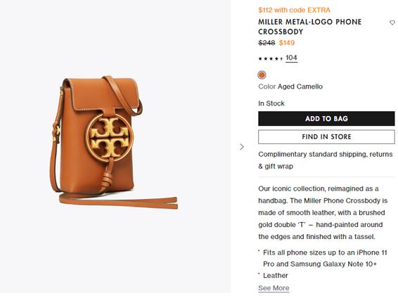 | 内容: | 网站需在境外网络环境下打开! Tory Burch美国官网选包包、美鞋低至5折促销,可叠加额外75折优惠,需用码:EXTRA; 其中这款TORY BURCH汤丽柏琦 Miller Leather手机包,售价降至6折$149,用码折后价$112,美国境内免邮。 这款可以同时放上手机、小镜子、口红、小包纸巾、零钱。