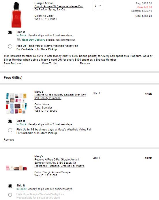 | 内容: | 网站需在境外网络环境下打开! Macys梅西百货的Giorgio Armani阿玛尼Si Passione红色挚爱香水 100ml,现在售价降至6折$76.8,订单满$25美国境内免运费。 -另外任意美妆订单满$50送神秘小样礼包; -任意美妆订单满$150送阿玛尼5小样,满额自动加车; Giorgio Armani的Sì Passione Intense是一款东方型花香调的女用香水。在2020年推出的, 这款香水的调香师是Julie Masse, 前调是黑醋栗糖浆; 中调是茉莉;基调是白麝香、广藿香、雪松和香草。