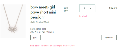 kate spade美国官网现有这款Kate Spade 凯特丝蓓 蝴蝶结mini项链,售价降至37折$22,美国包邮,需要可入;